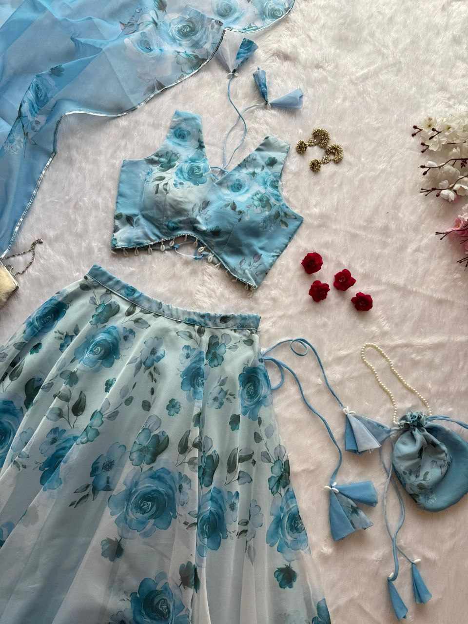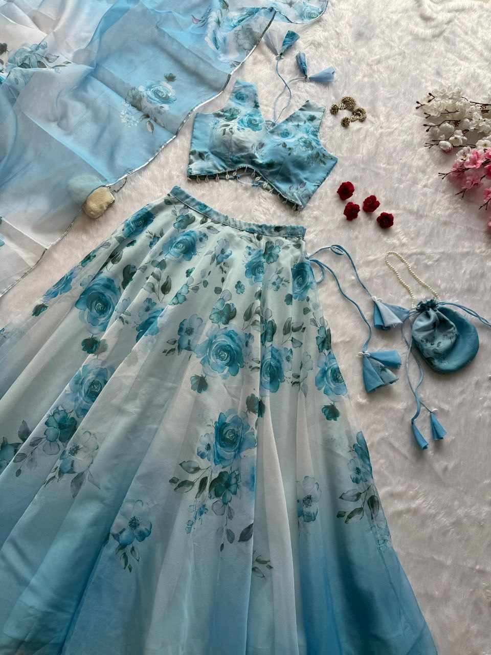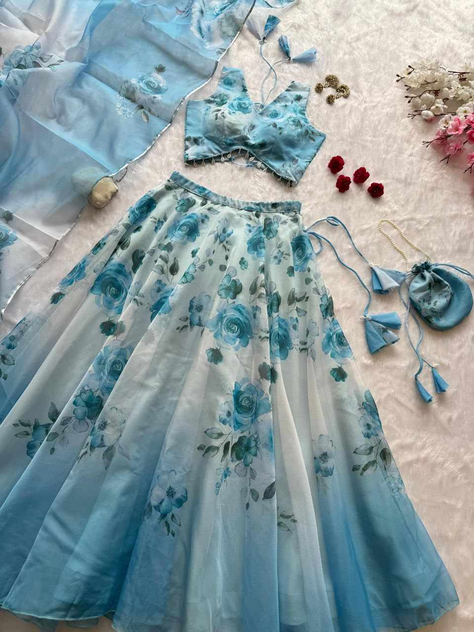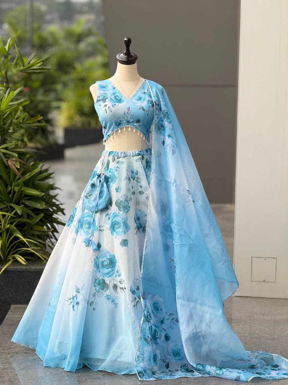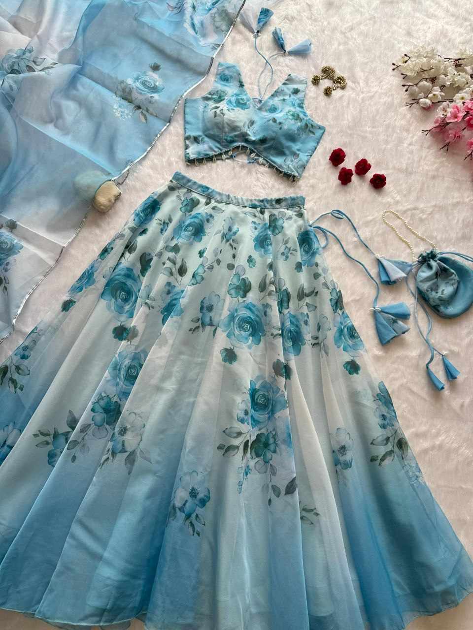 Lehenga – Pure organza silk digital printed lehenga with a grand 8-meter flair. Finished with canvas patta for a perfect flare