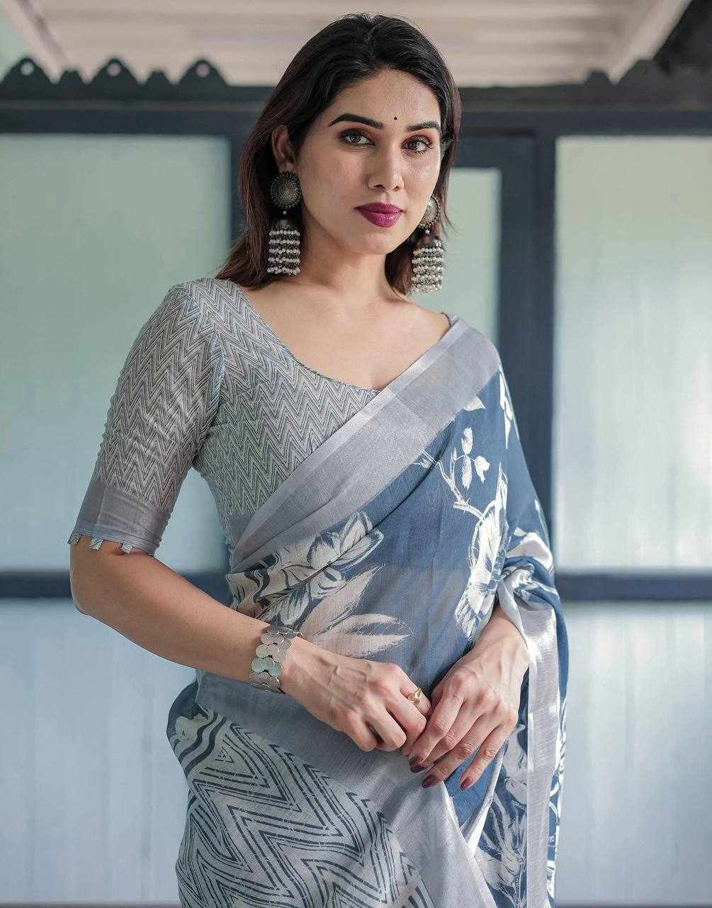 Fabric: Silver Weaving Patta Linen Cotton Saree with beautiful digital print (5.5 meters)