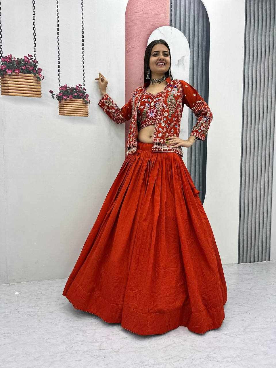 PC 559 New Modern Party Wear Red Lehnga With Jacket has been successfully added to your cart .