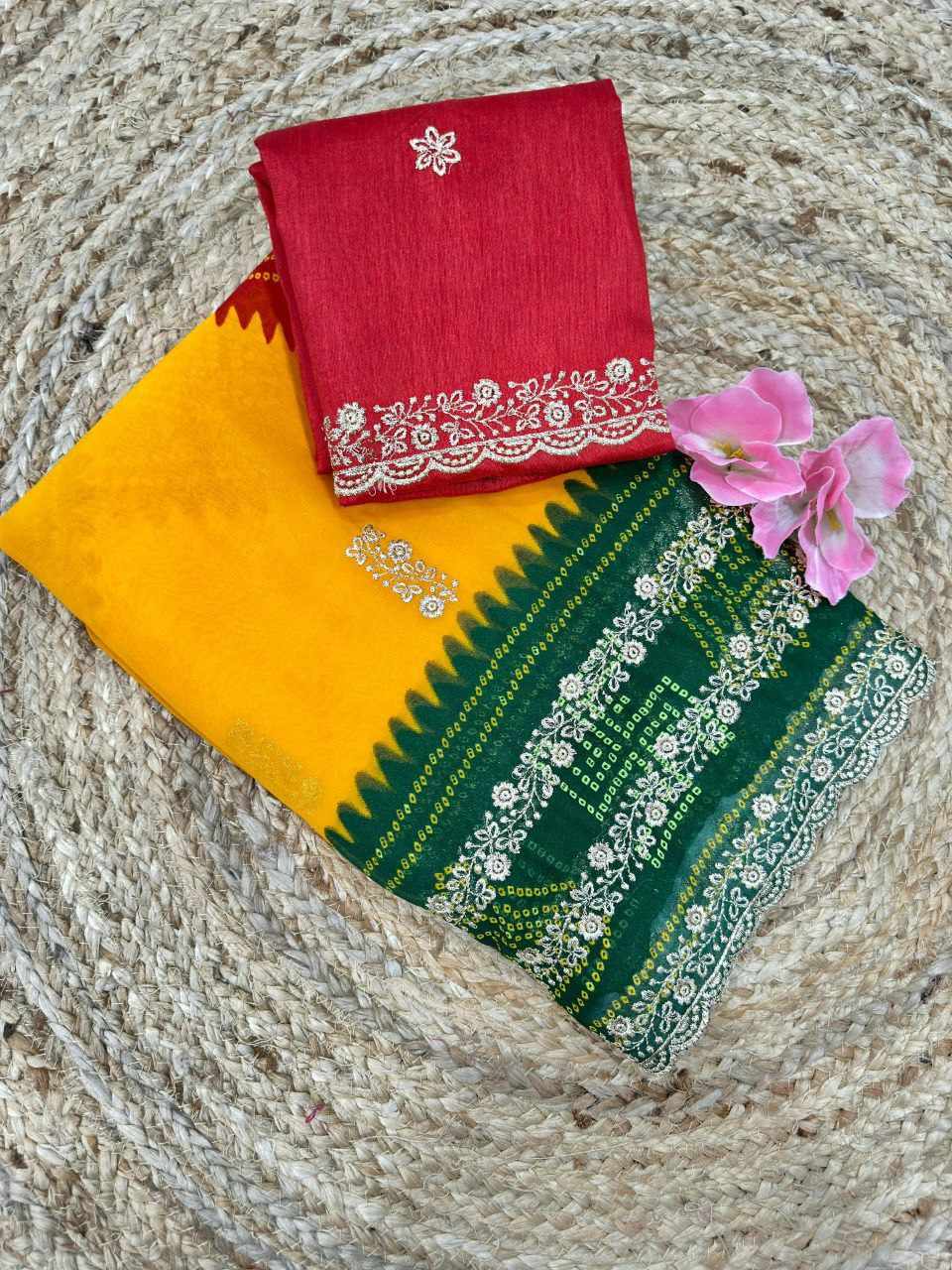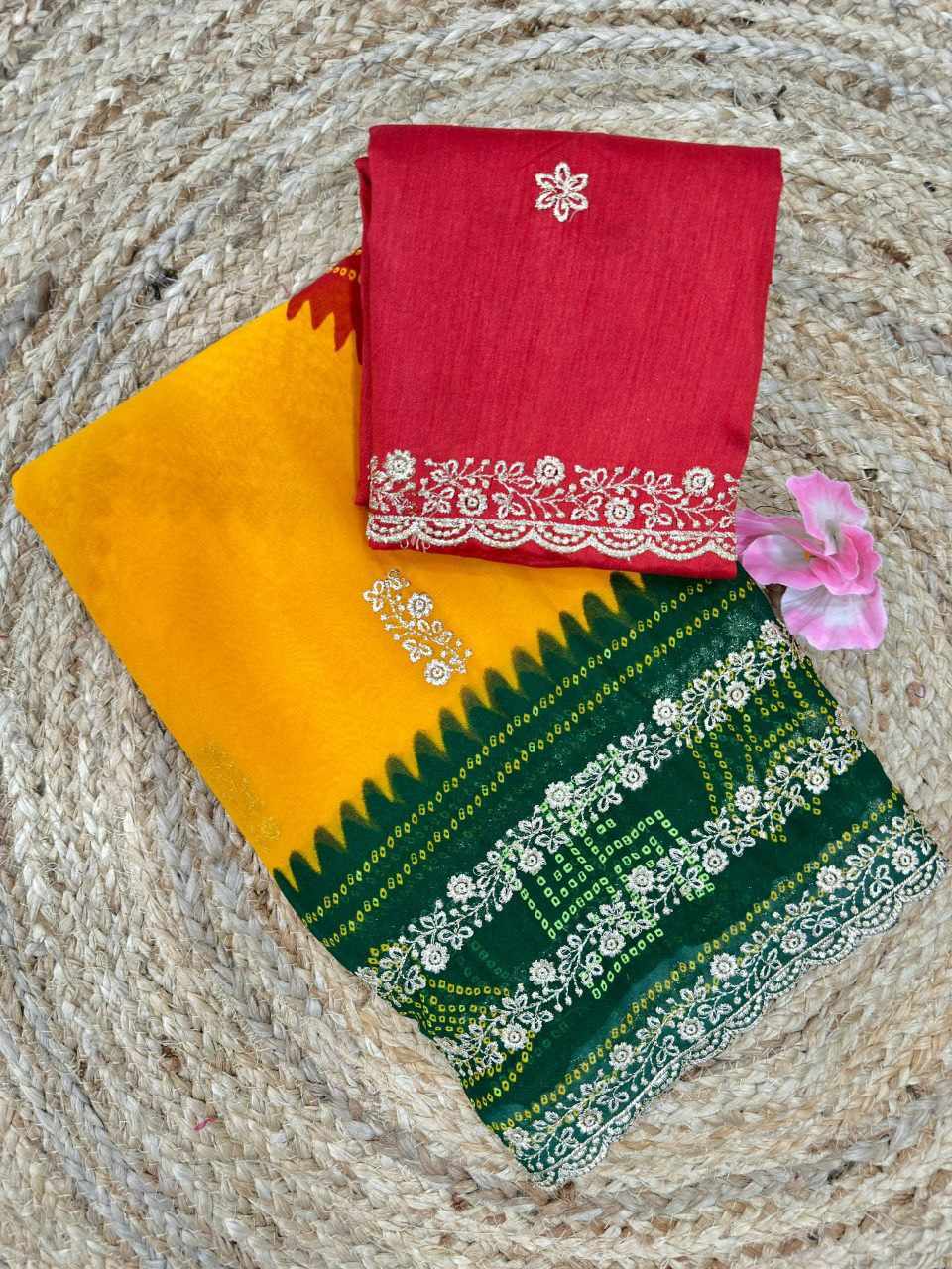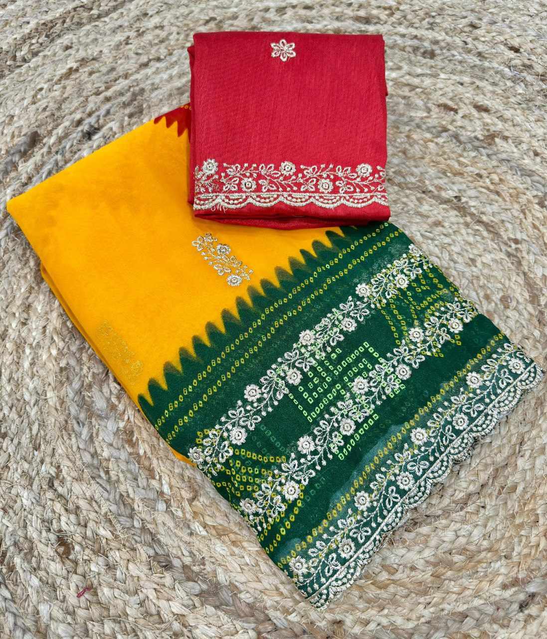 PIYU P1052 LEHERIYA BANDHANI-1 Yellow-Green Saree